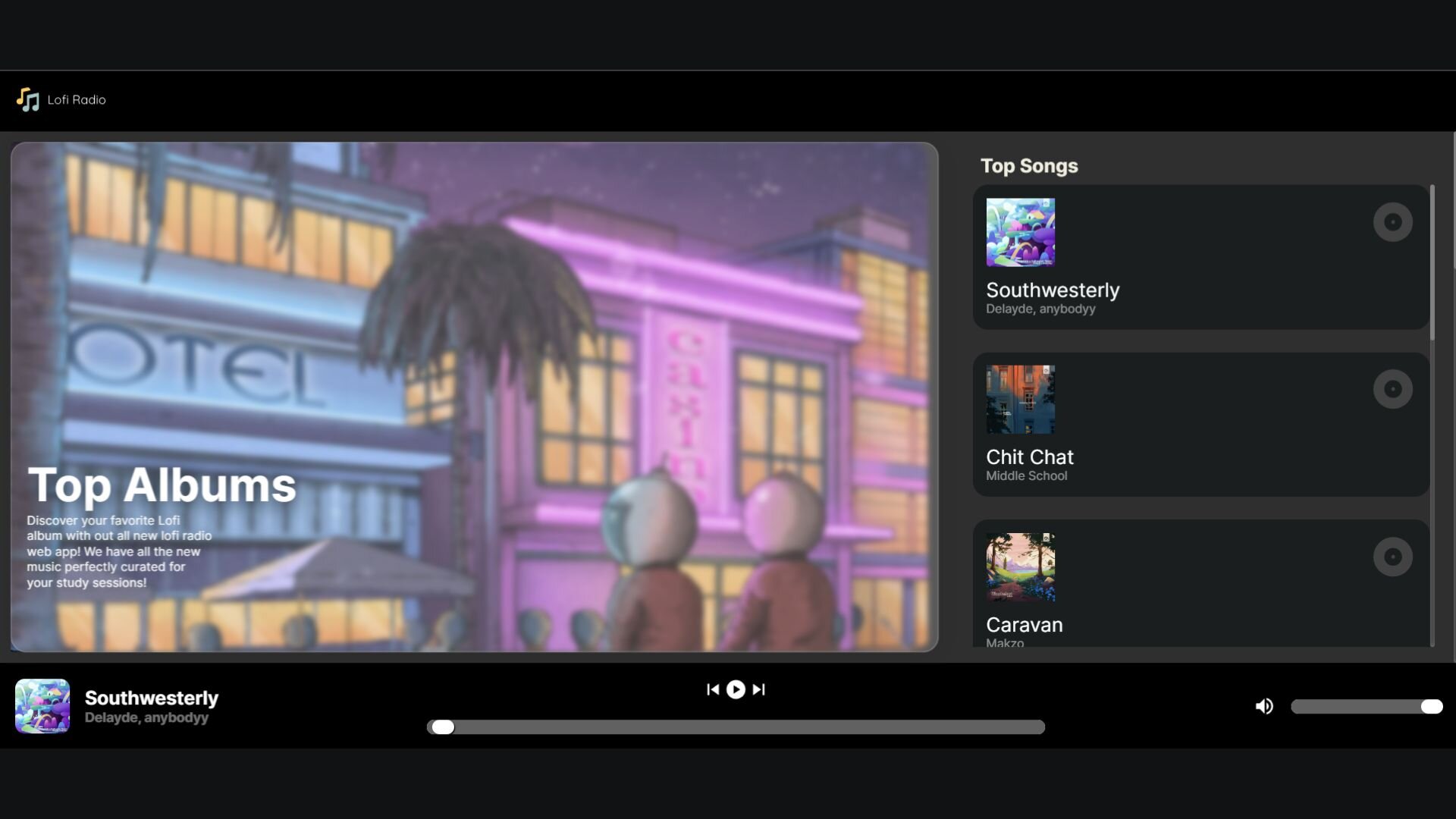 Design an interface for listening to lofi music from ChillHops across three pages, enabling effortless playback control.
